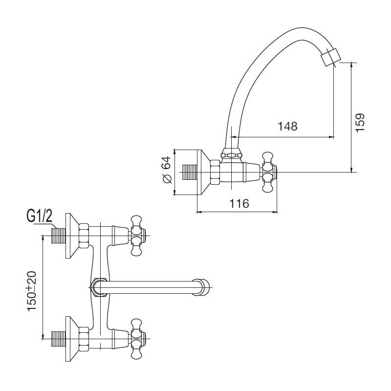 Robinet bimando de montage de la céramique modèle Classique au fini chrome pour évier de cuisine. La conception de type murale pour une installation dans le mur. La Distance entre les plans: 15 cm