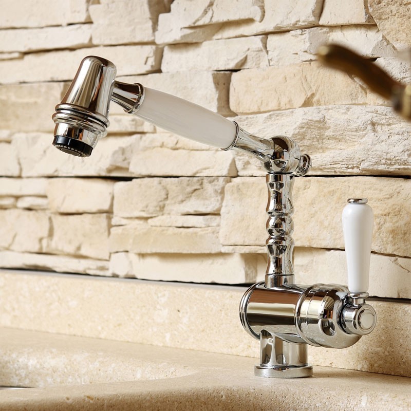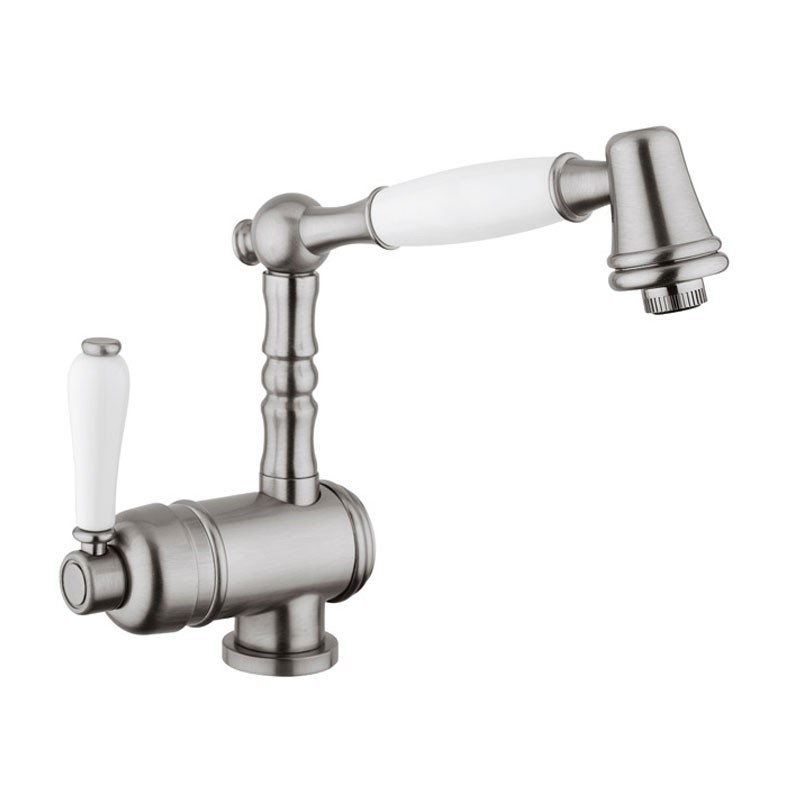 Robinet de cuisine modèle Torino type mixage, bec verseur amovible et design italien classique en acier inoxydable finition chrome, bronze ou inox au choix.