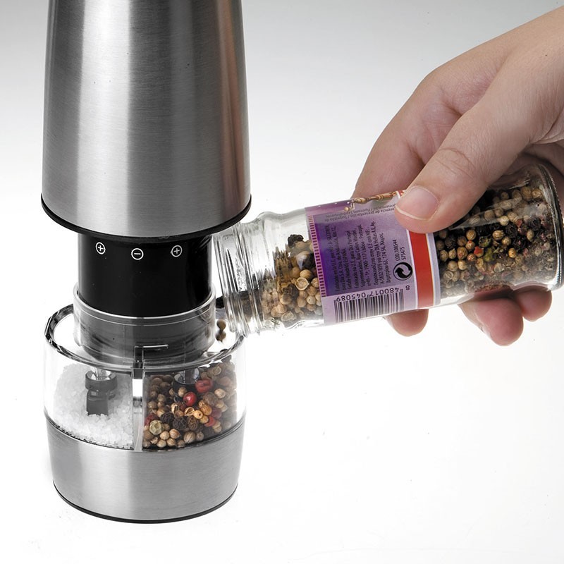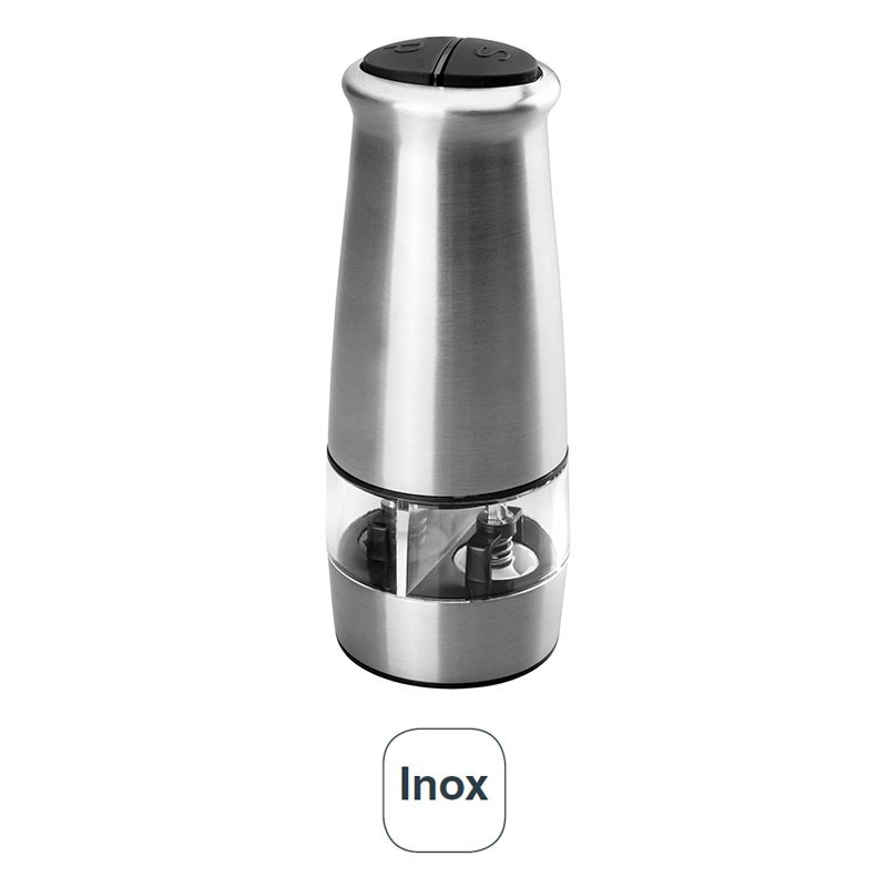 Broyeur électrique 2 en 1 sel et poivre en acier inoxydable 18/10 de haute qualité et poussoir indépendant. Mesures: 7x18 cm