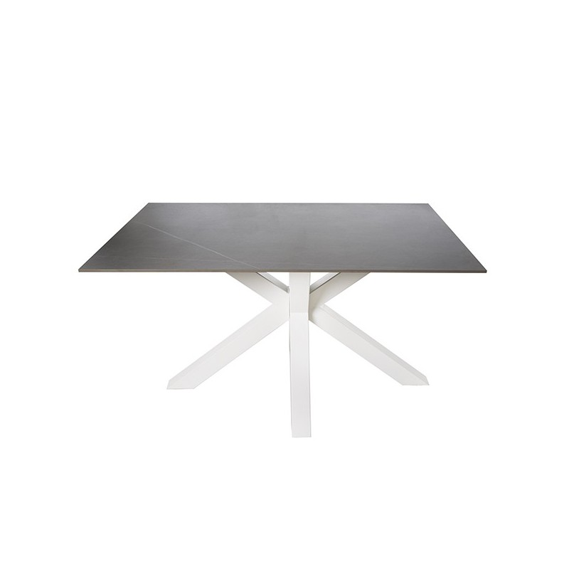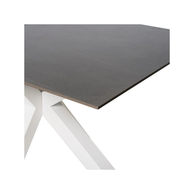 Avec un plateau en céramique avec une couche de verre trempé, la table JOYCE est résistante et facile à nettoyer, avec une finition qui imite le marbre pour une touche d'élégance. Ses pieds épais en métal entrecroisés lui confèrent stabilité et un aspect artistique.