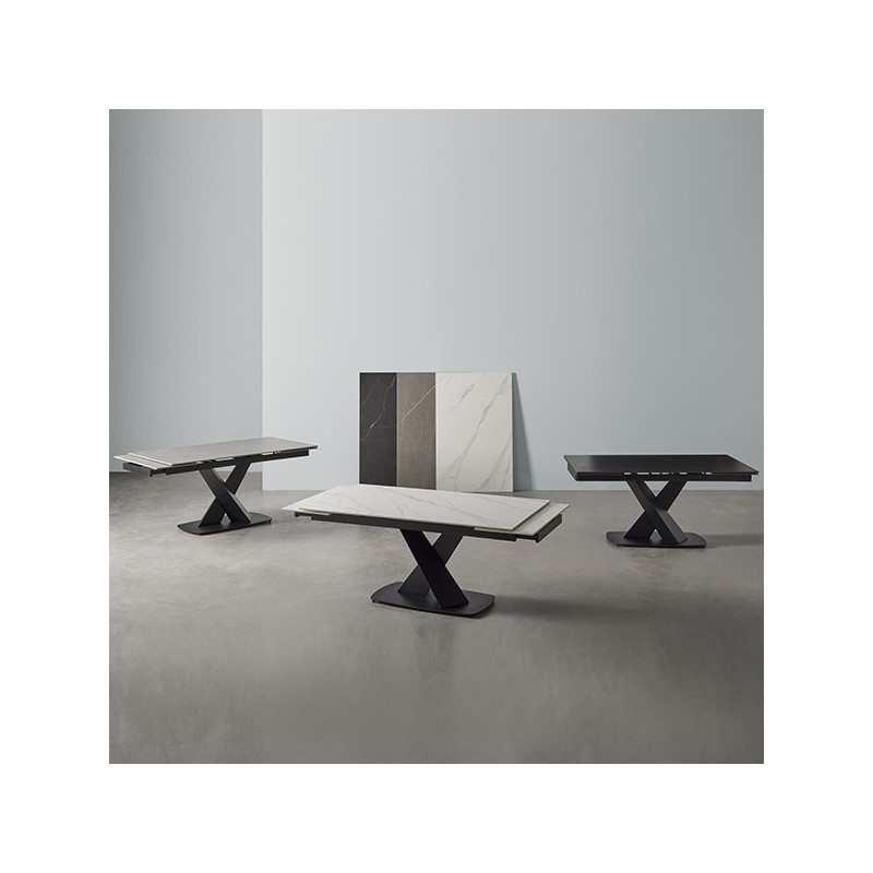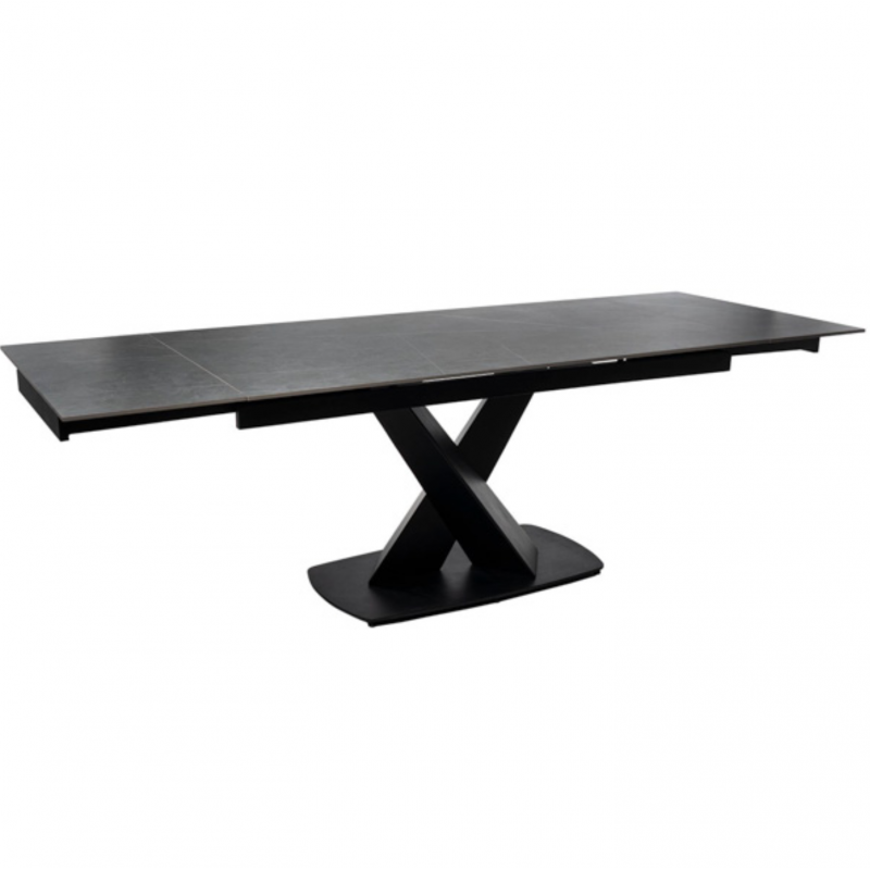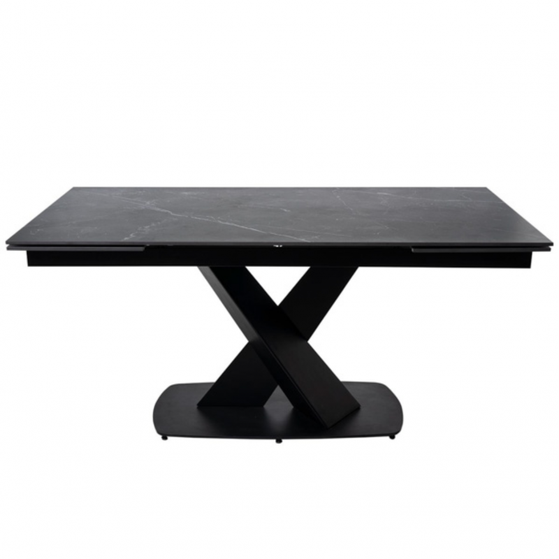 Découvrez l'élégance et la fonctionnalité de la table extensible VALERI 160 en couleur noir/noir. Cette table extensible présente un plateau de 10mm en porcelaine massive dans un ton noir sophistiqué, combiné avec des pieds en métal assortis. Son design moderne et polyvalent en fait le complément parfait pour votre maison.