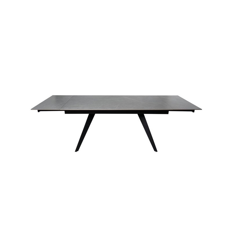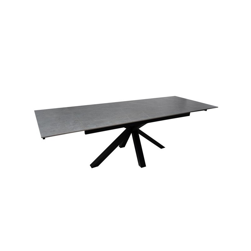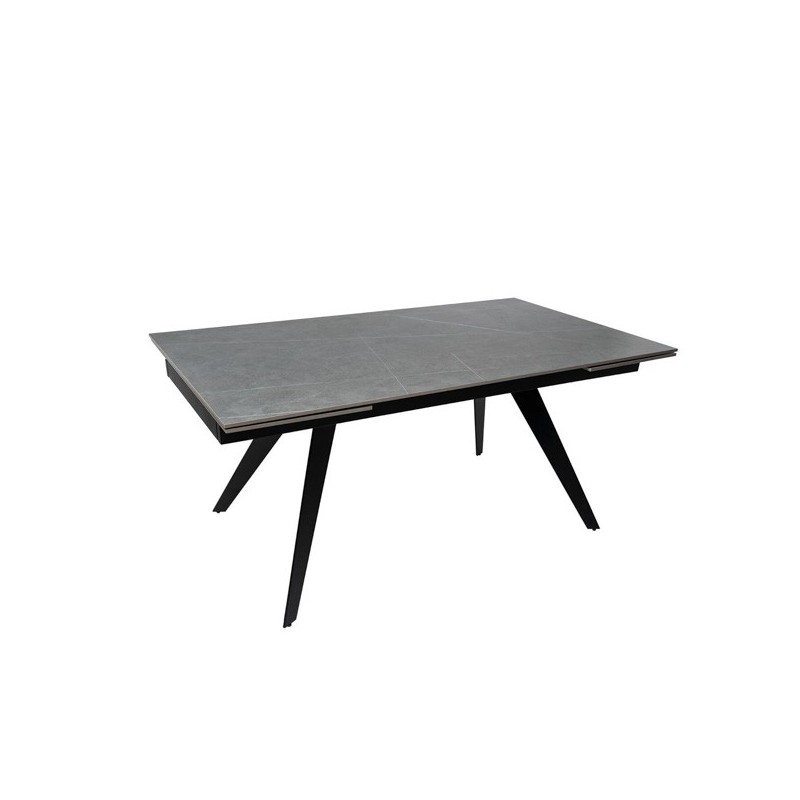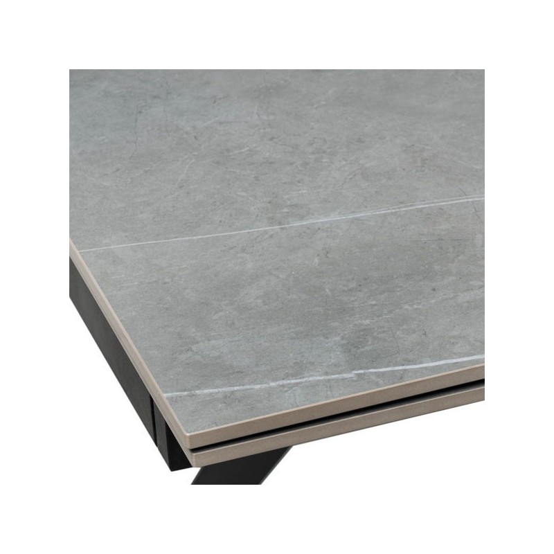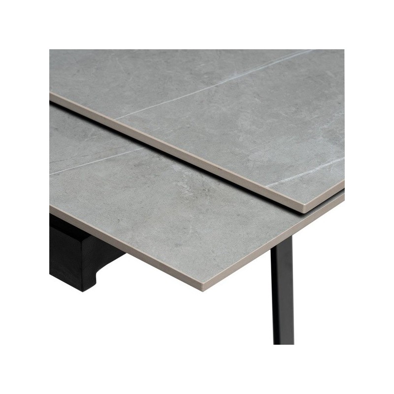 Découvrez la table extensible KELLY 160 gris/noir, élégante et fonctionnelle, un meuble au design moderne qui combine parfaitement le grès cérame massif de couleur grise avec des pieds métalliques solides en noir. Idéale pour s'adapter à vos besoins d'espace, cette table extensible dispose d'un plateau en grès cérame de 10 mm qui la rend résistante aux rayures, à la chaleur, au feu, aux produits chimiques et plus encore.