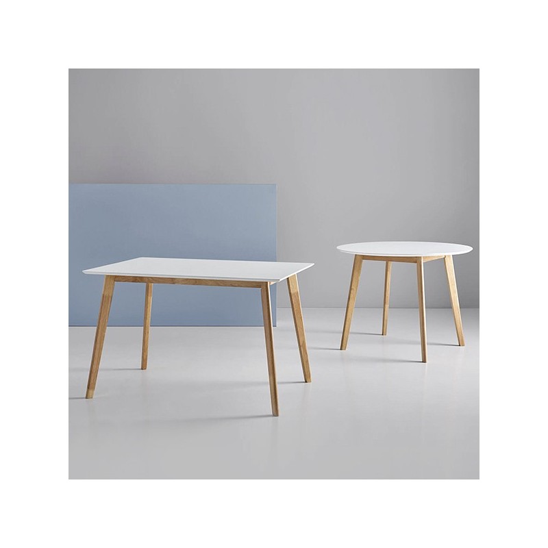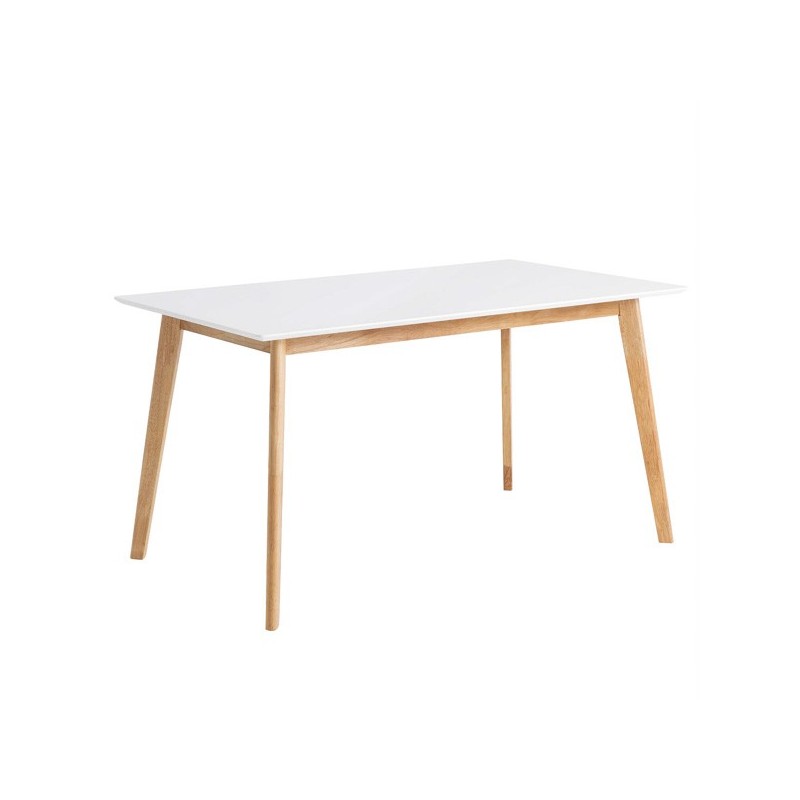 Découvrez la table fixe MARIE 140 blanc/chêne, un meuble en bois qui allie élégance et fonctionnalité. Avec un plateau laqué blanc de 20mm d'épaisseur et des pieds en hévéa, cette table rectangulaire de 140x80cm est parfaite pour les cuisines et salles à manger de style nordique.