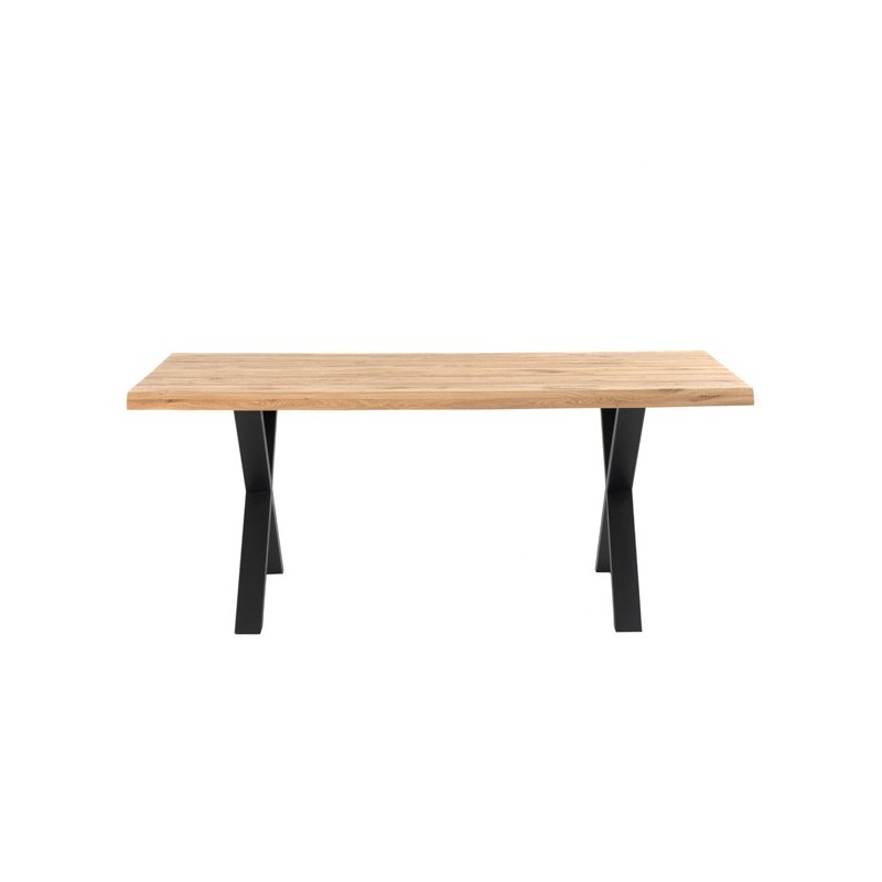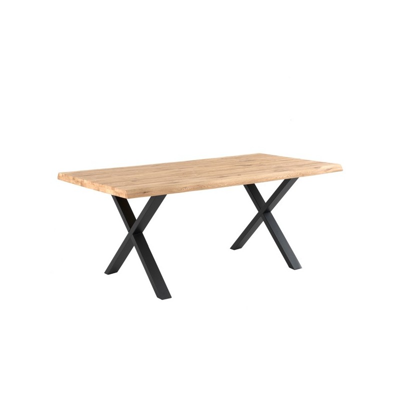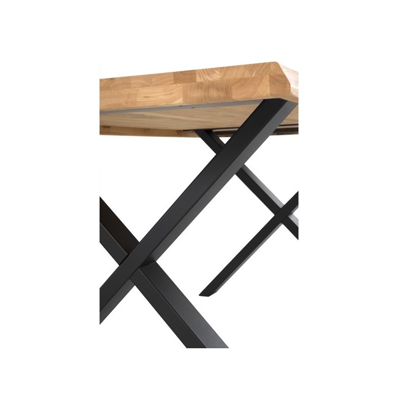 Table fixe CORINE de 140x90 cm, design moderne et élégant en chêne massif et pieds en métal noir en forme de X. Idéal pour les environnements industriels.