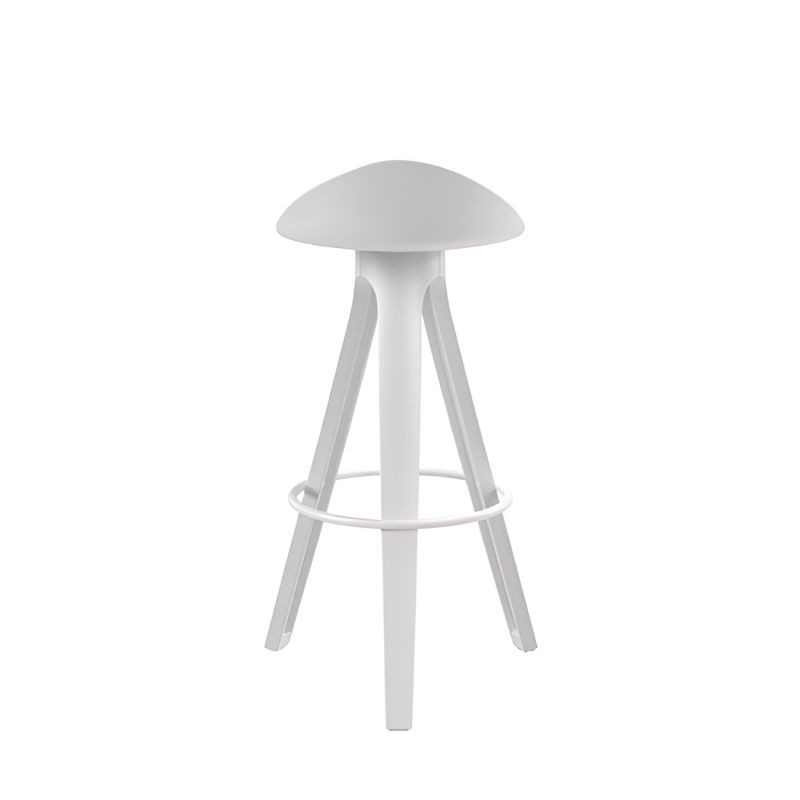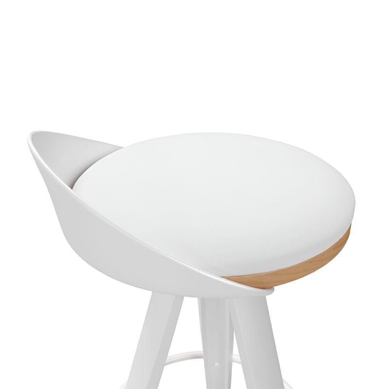 Tabouret DUKE blanc : design élégant et confort exceptionnel. Siège rembourré en bois blanc, dossier et repose-pieds circulaire pour un soutien supplémentaire.