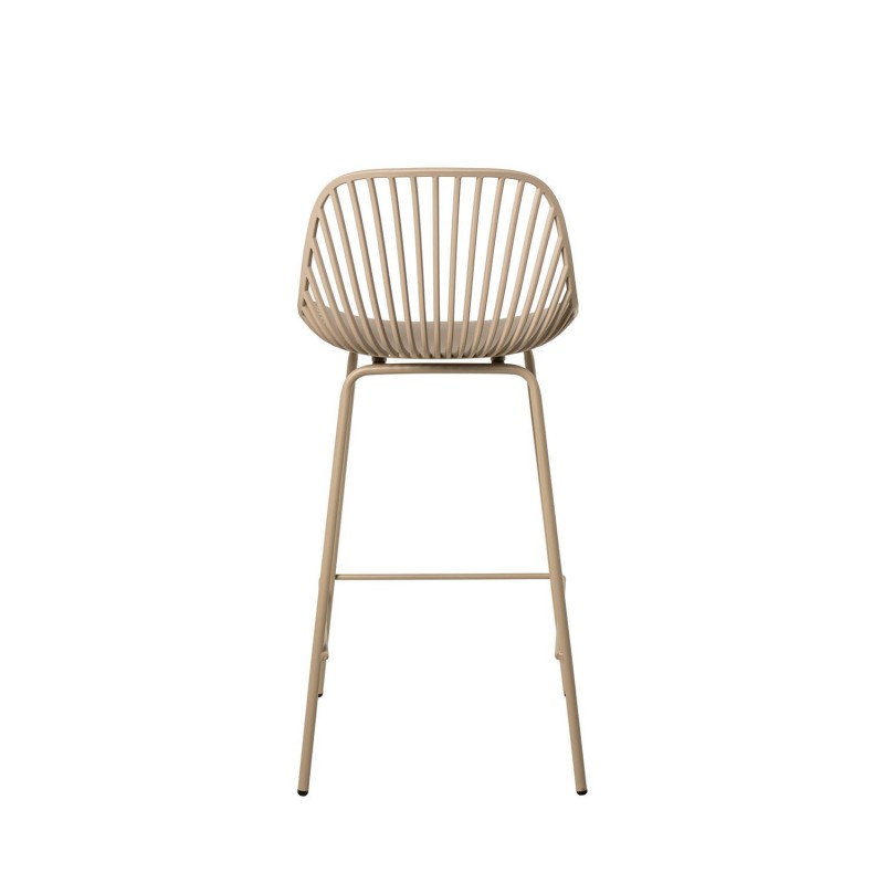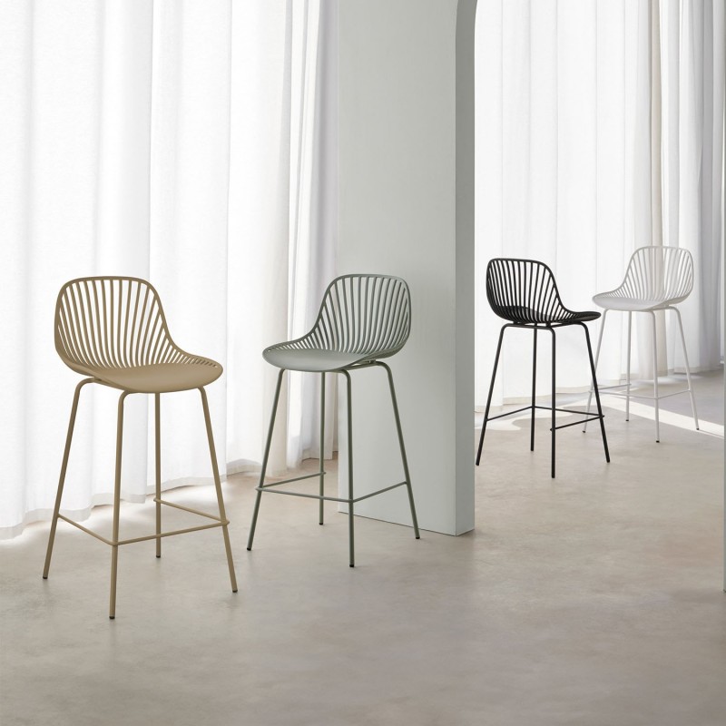 Tabouret bas PEYTON beige avec un design original, dossier ouvert et assise en polypropylène. Pieds en métal laqué mat et repose-pieds. Style moderne.