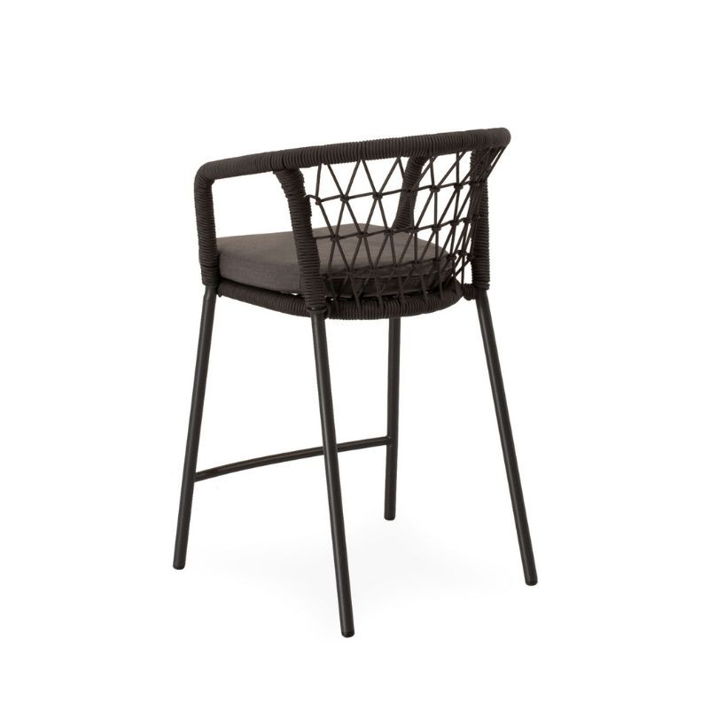 Le tabouret d'extérieur EDWIN gris a un dossier incurvé, enveloppé de corde entrelacée, et des pieds en acier robustes et légèrement inclinés.