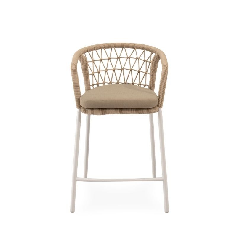 Le tabouret d'extérieur EDWIN blanc a un dossier incurvé, enveloppé de corde entrelacée, et des pieds en acier robustes et légèrement inclinés.