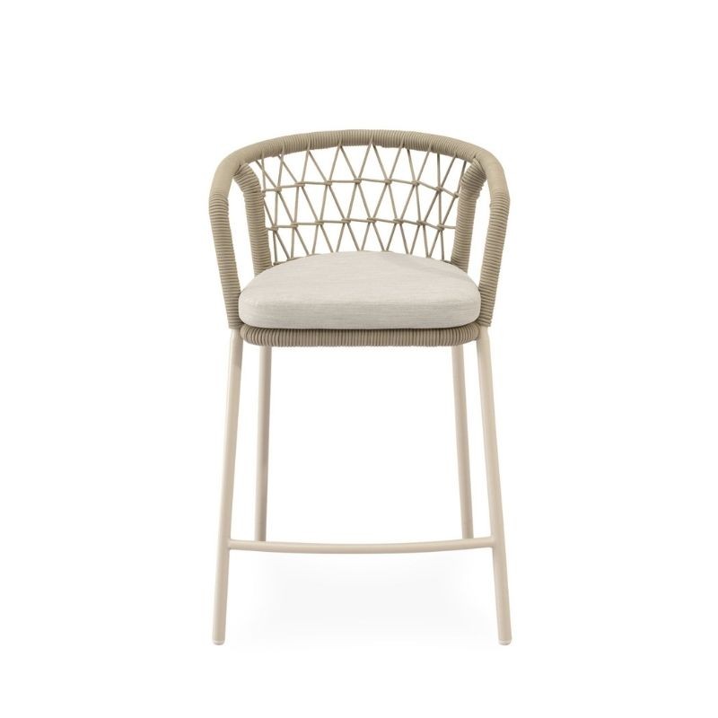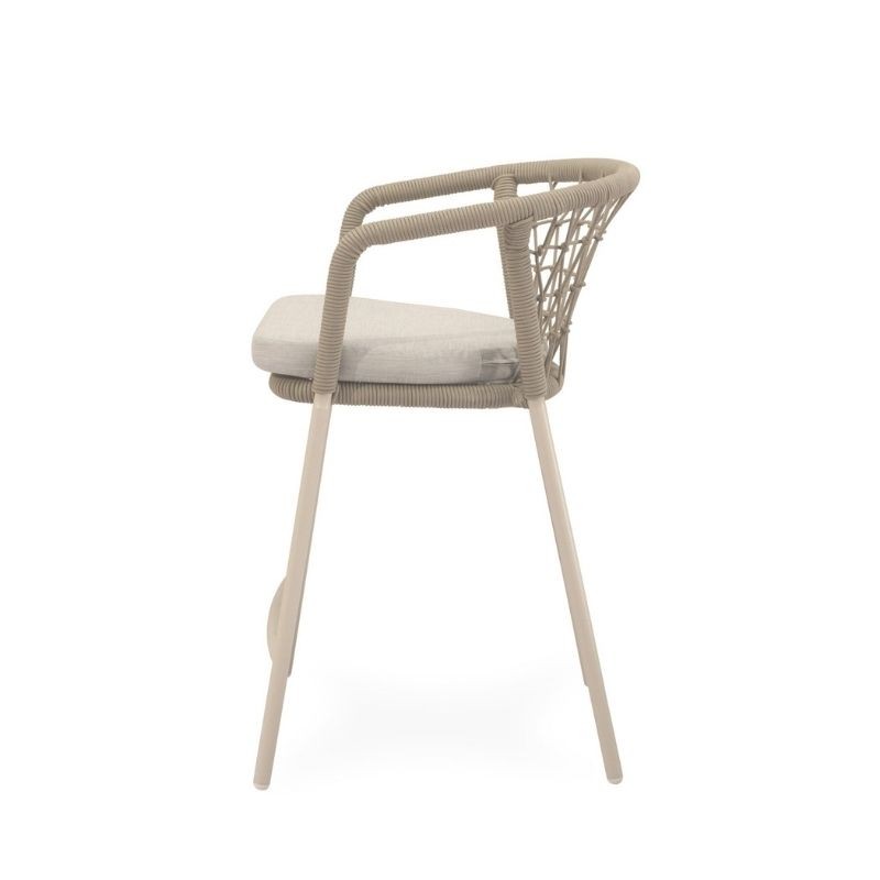 Le tabouret d'extérieur EDWIN beige a un dossier incurvé, enveloppé de corde entrelacée, et des pieds en acier robustes et légèrement inclinés.