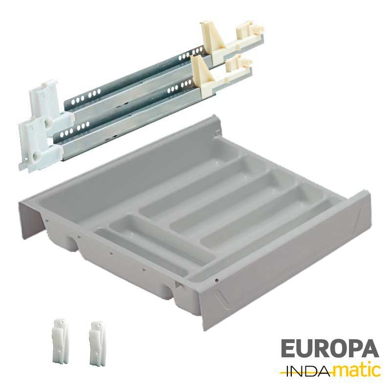 Tiroir en PVC injecté gris (RAL 7040) avec porte-couverts et guides d'extraction partielle pour meubles d'une profondeur intérieure minimale de 50 cm.