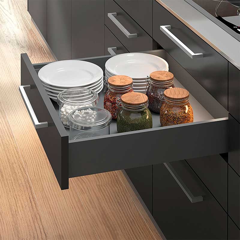 Kit de tiroir de cuisine ou de salle de 93 mm de hauteur en acier de couleur gris anthracite avec guides de 50 cm de profondeur. Comprend base et l'arrière de mélamine.