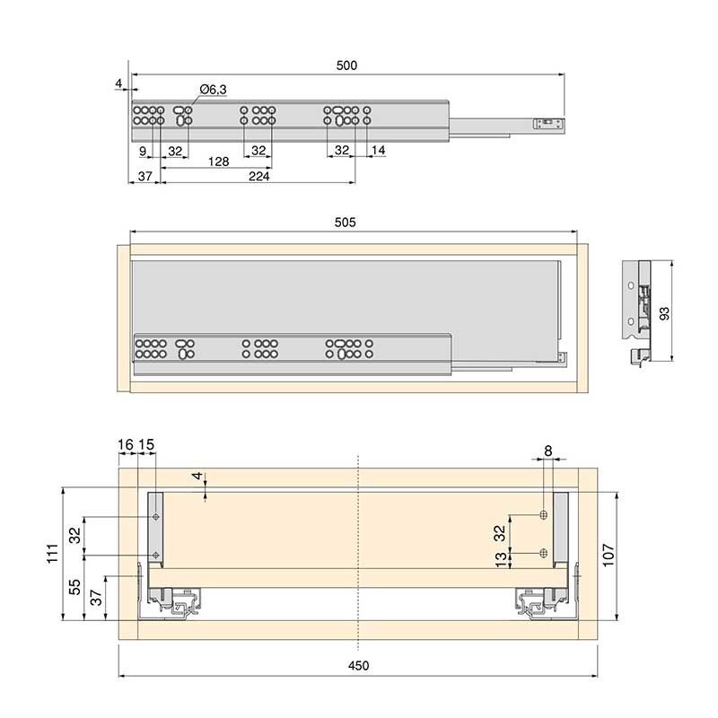 Le kit de tiroir Vertex de Emuca est fourni avec guides en acier standard de mesure de 50 cm de bas, de côté, de côté 93 mm de hauteur, d'anthracite et de base et à l'arrière de la mélamine de 16 mm d'épaisseur, gris anthracite avec une finition rugueuse pour une meilleure résistance de la surface.