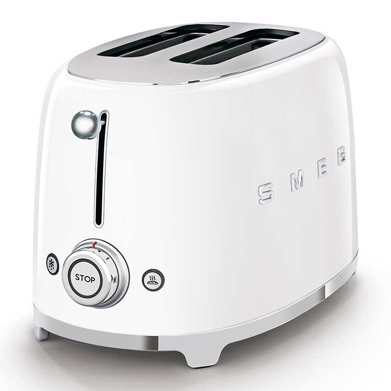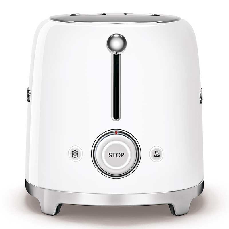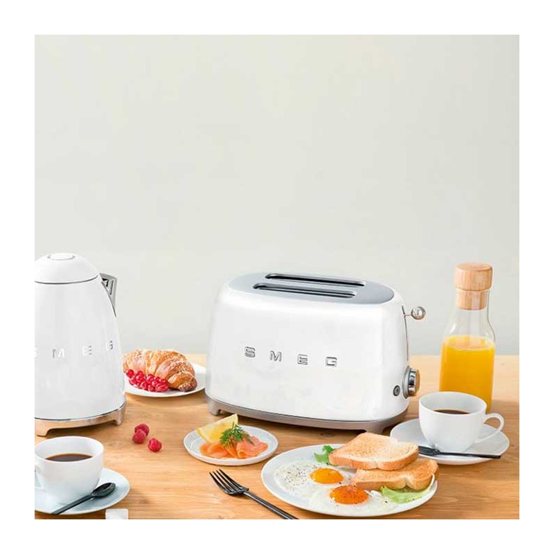 Grille-pain de style Smeg 50 avec corps en acier inoxydable blanc brillant avec 6 niveaux de chauffage et 2 fentes pour 2 toasts.