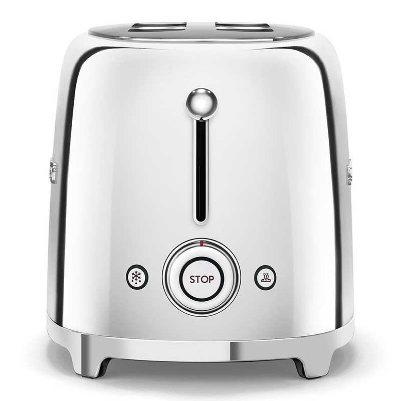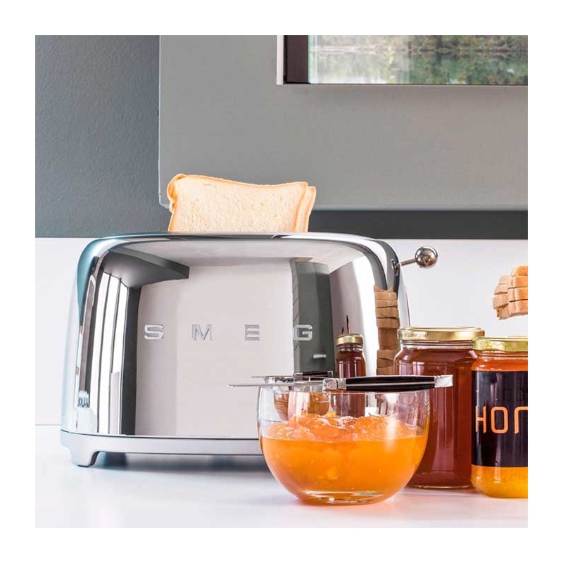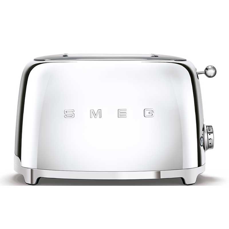 Grille-pain de style Smeg 50 avec corps en acier inoxydable en finition chromée brillante avec 6 niveaux de chauffage et 2 fentes pour 2 toasts.