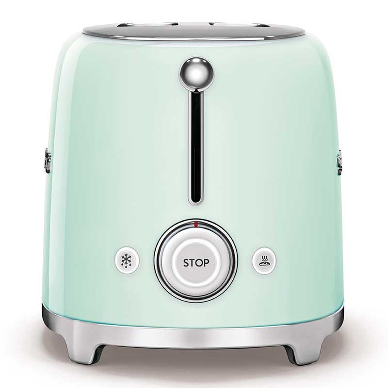 Grille-pain de style Smeg 50 avec corps en acier inoxydable couleur vert brillant à l'eau avec 6 niveaux de chauffage et 2 fentes pour 2 toasts.