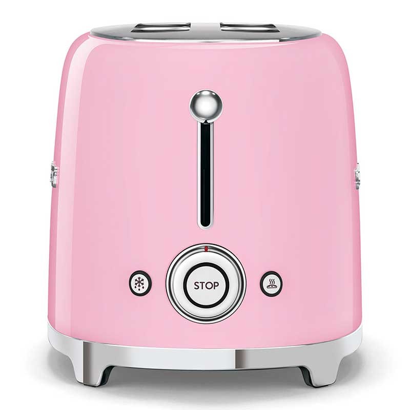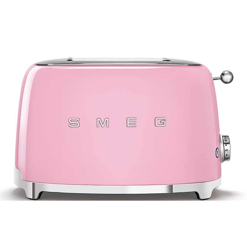 Grille-pain de style Smeg 50 avec corps en acier inoxydable rose brillant avec 6 niveaux de chauffage et 2 fentes pour 2 toasts.