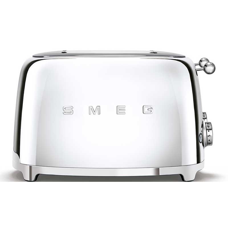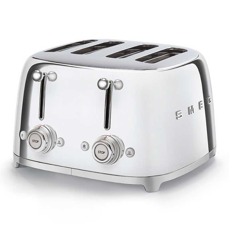 Grille-pain de style Smeg 50 avec corps en acier inoxydable avec finition chromée brillante avec 6 niveaux de chauffage et 4 fentes pour 4 toasts.