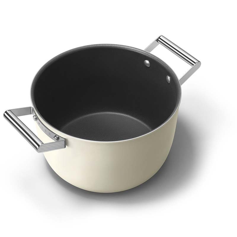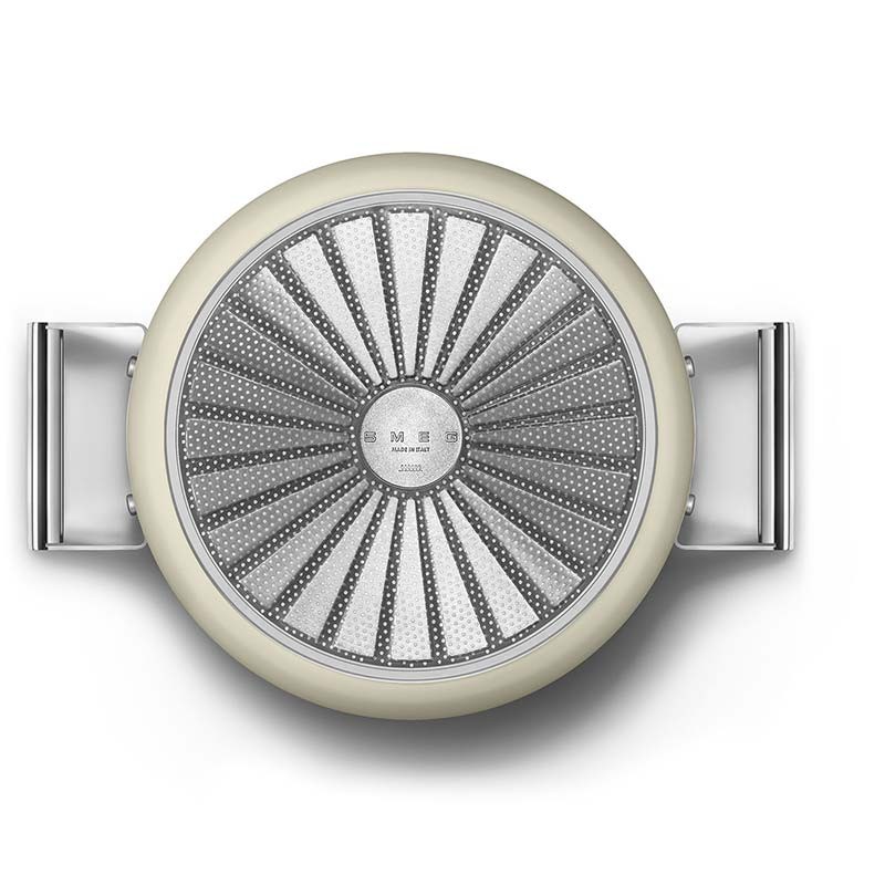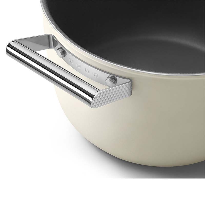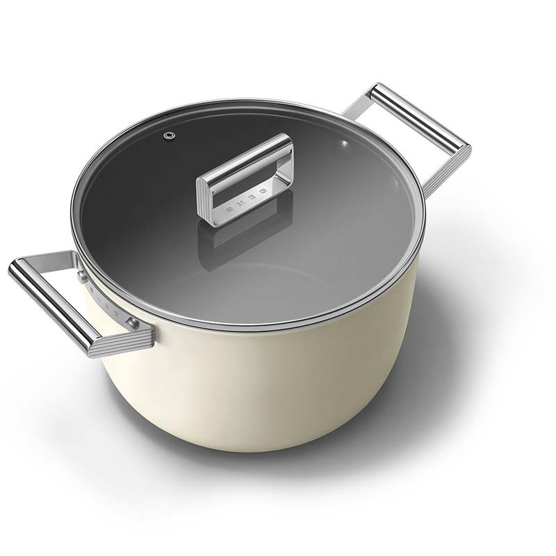 Casserole haute antiadhésive avec couvercle style Smeg années 50 de 26 cm de diamètre, corps en aluminium forgé et finition extérieure beige crème mat.