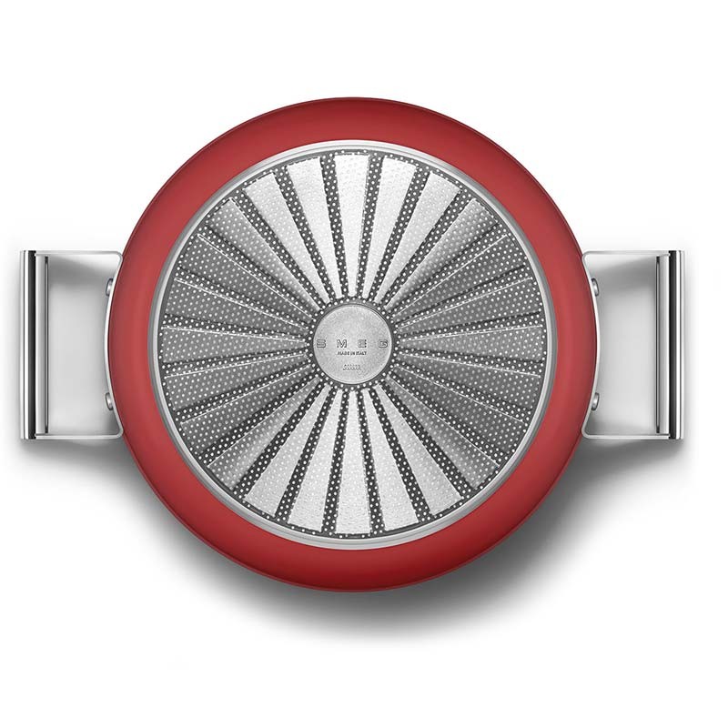 Casserole basse antiadhésive avec couvercle style Smeg années 50 de 28 cm de diamètre, corps en aluminium forgé et finition extérieure rouge mat.