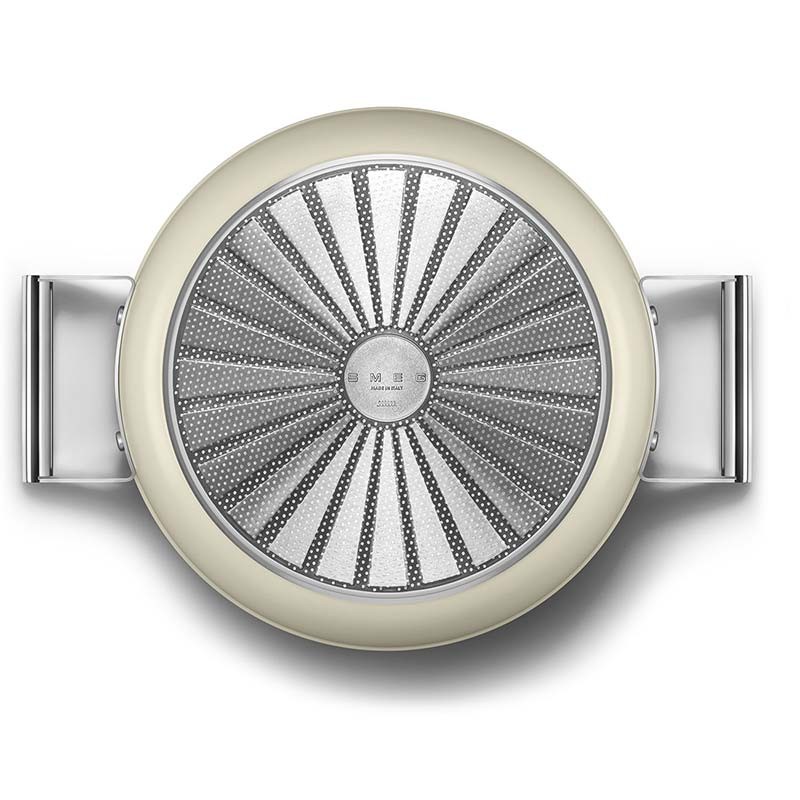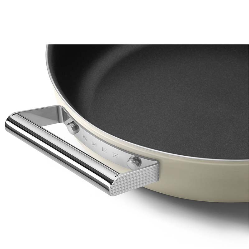 Casserole basse antiadhésive avec couvercle style Smeg années 50 de 28 cm de diamètre, corps en aluminium forgé et finition extérieure beige crème mat.