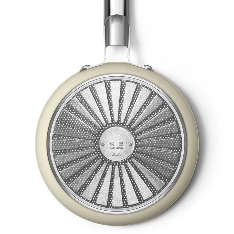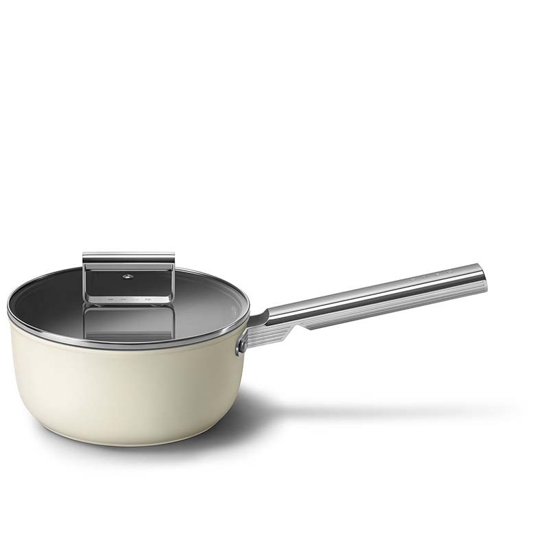 Casserole antiadhésive avec couvercle style Smeg années 50 de 20 cm de diamètre, corps en aluminium forgé et finition extérieure beige crème mat.
