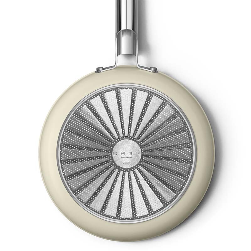 Poêle antiadhésive style Smeg années 50 de 26 cm de diamètre, corps en aluminium forgé et finition extérieure beige crème mat.