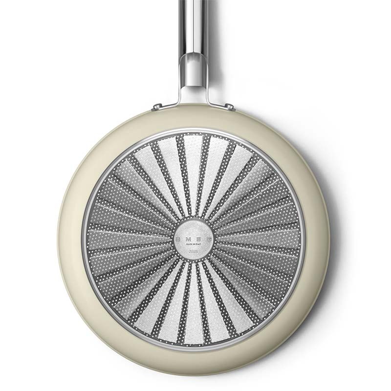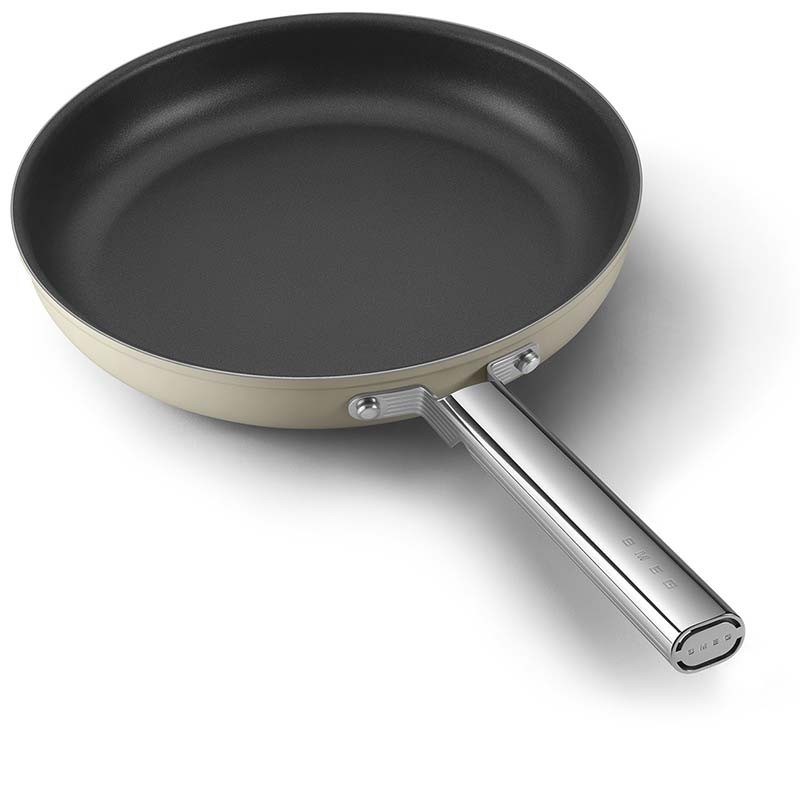 Poêle antiadhésive de style Smeg années 50 de 30 cm de diamètre, corps en aluminium forgé et finition extérieure beige crème mat.