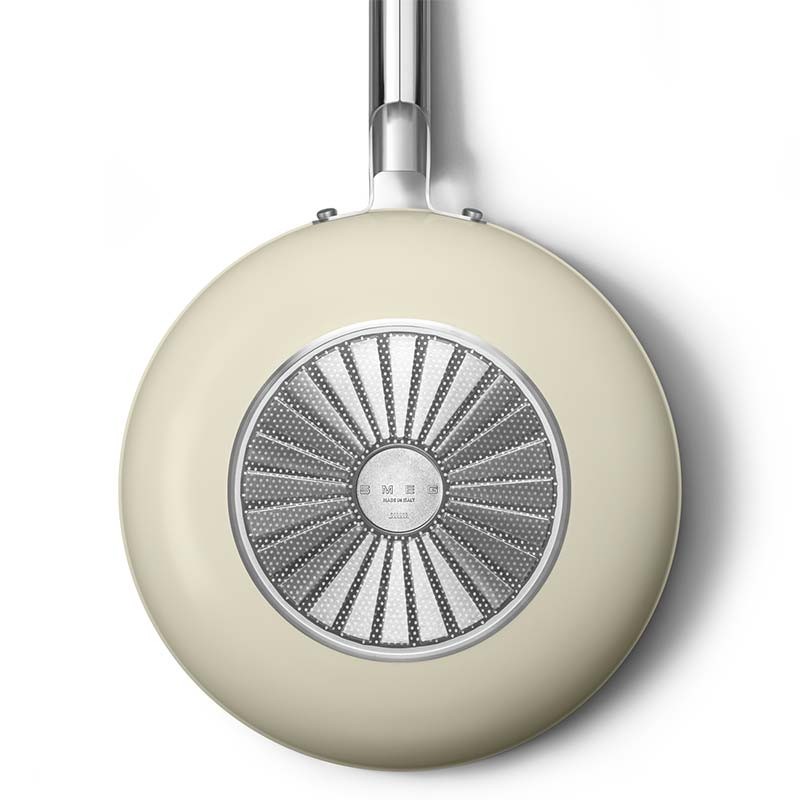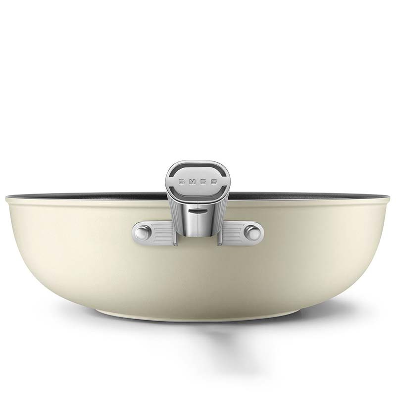 Wok antiadhésif de style Smeg années 50 de 30 cm de diamètre, corps en aluminium forgé et finition extérieure beige crème mat.