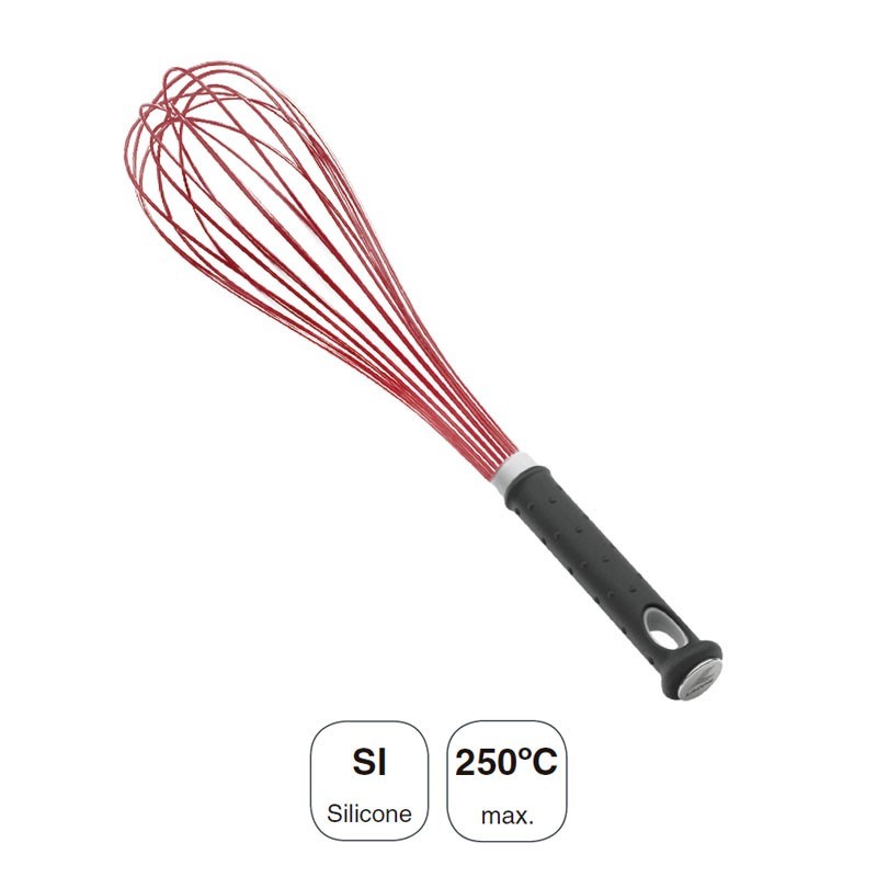 Fouet en silicone non-déformable tige en fibre de verre ergonomique idéale pour le traitement de la pâtisserie. Disponible en différentes tailles.