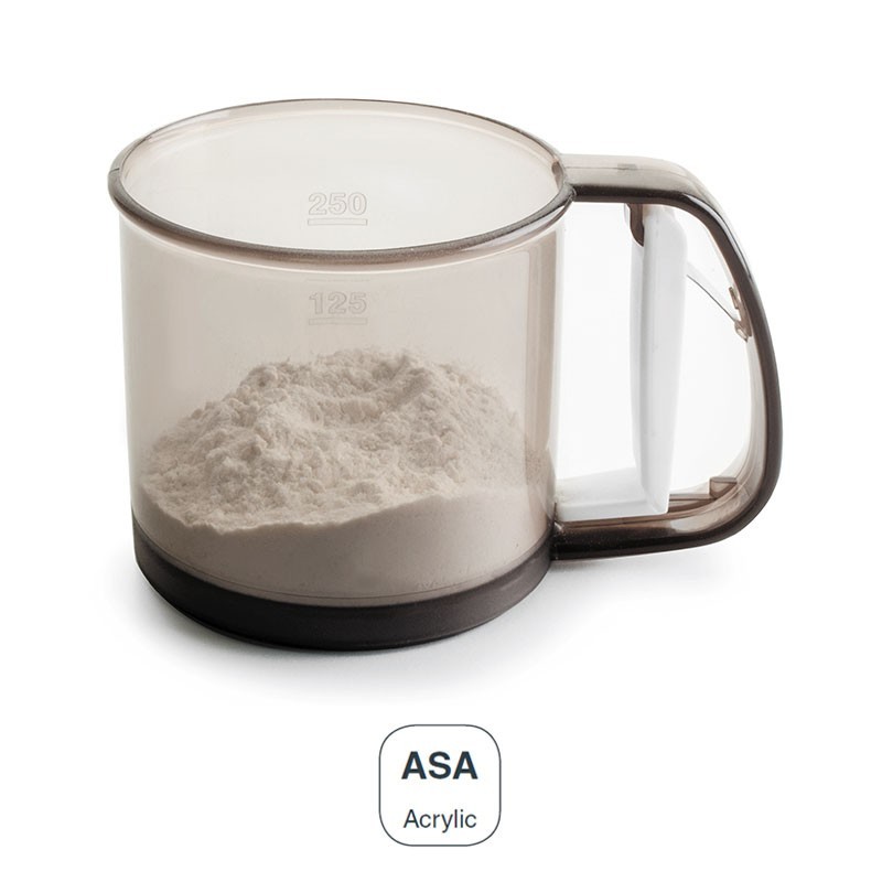 Cribador de farine de 10 cm de diamètre et de 0,35 kg capacité en acrylique en plastique de grande résistance. Lecteur de déclenchement.