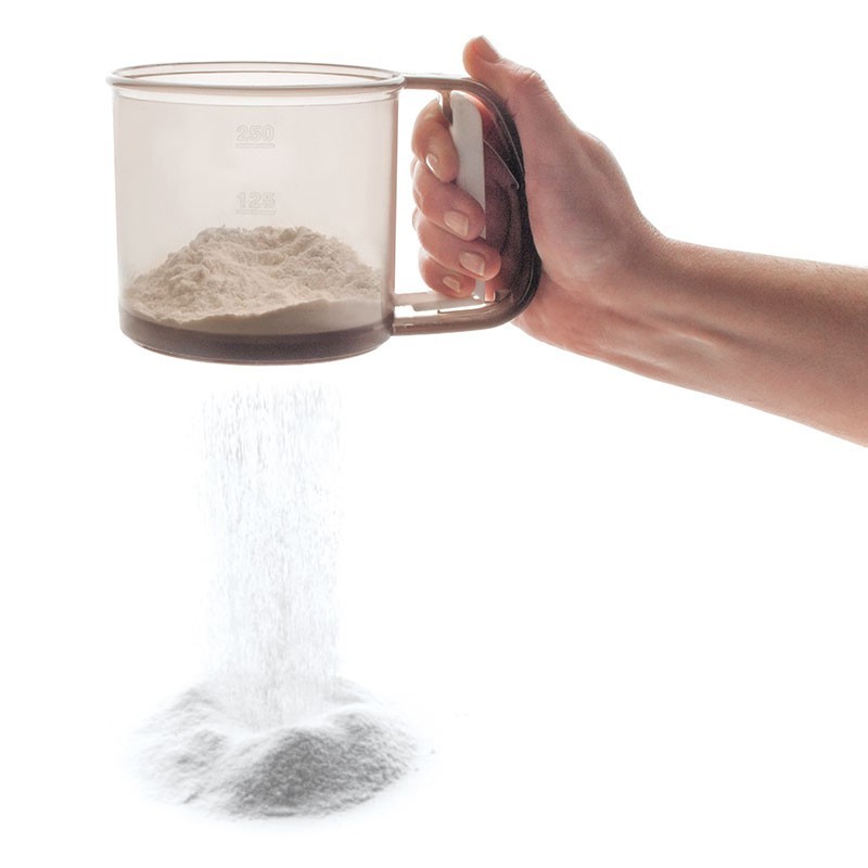 La poignée de cette cribador de farine en plus de l'aide de votre grip intègre un mécanisme sous la forme d'un déclencheur pour déclencher la projection.