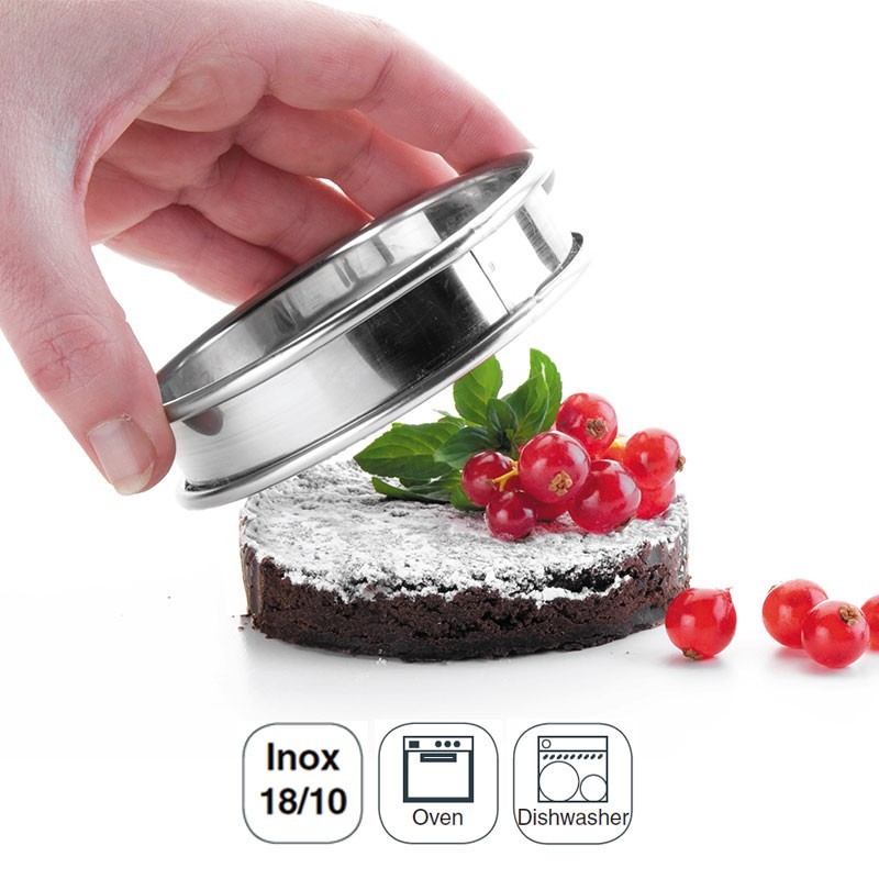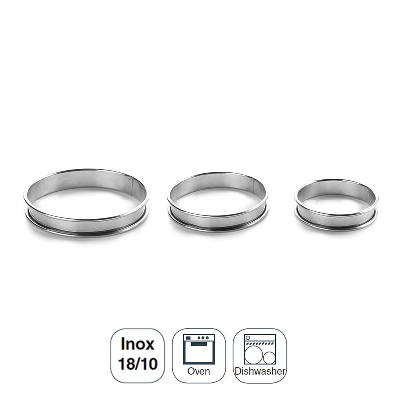 Bague ronde en acier inoxydable 18/10 avec des bords arrondis et 2,2 cm de hauteur idéale pour servir des petits plats ou des desserts. Disponible en différents diamètres.